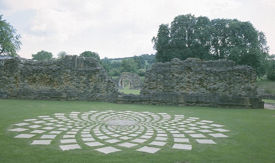 Gradually we reached the top of the crest, our serious climbing over for the day, and turned right at a farm gate to round a field and head for a distant stone pillar – though we were unable to determine exactly what was being memorialized here. Then a steep descent began, with views of Winchcombe below, and again we followed waymarks through the fields in the direction of a track that would take us to Hailes Abbey. I promised Tosh that she would find a loo here, but it did seem to take a long time to clear Hailes Fruit Farm (with orchards on our left) and reach the comforts of tarmac again.