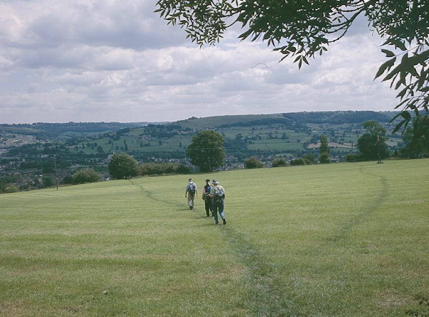 After passing through a field that was being preserved as a traditional meadow and dropping down between some hedges views opened out on a slope descending to the edge of the rugby pitch. A party of three walkers was tempted to go left here but I knew to aim for a disk at the right hand bottom of the field. Tosh got these three turned around but at the field corner they turned left to descend to the streambed of Wash Brook (a mistake) and we lost track of them for some time.