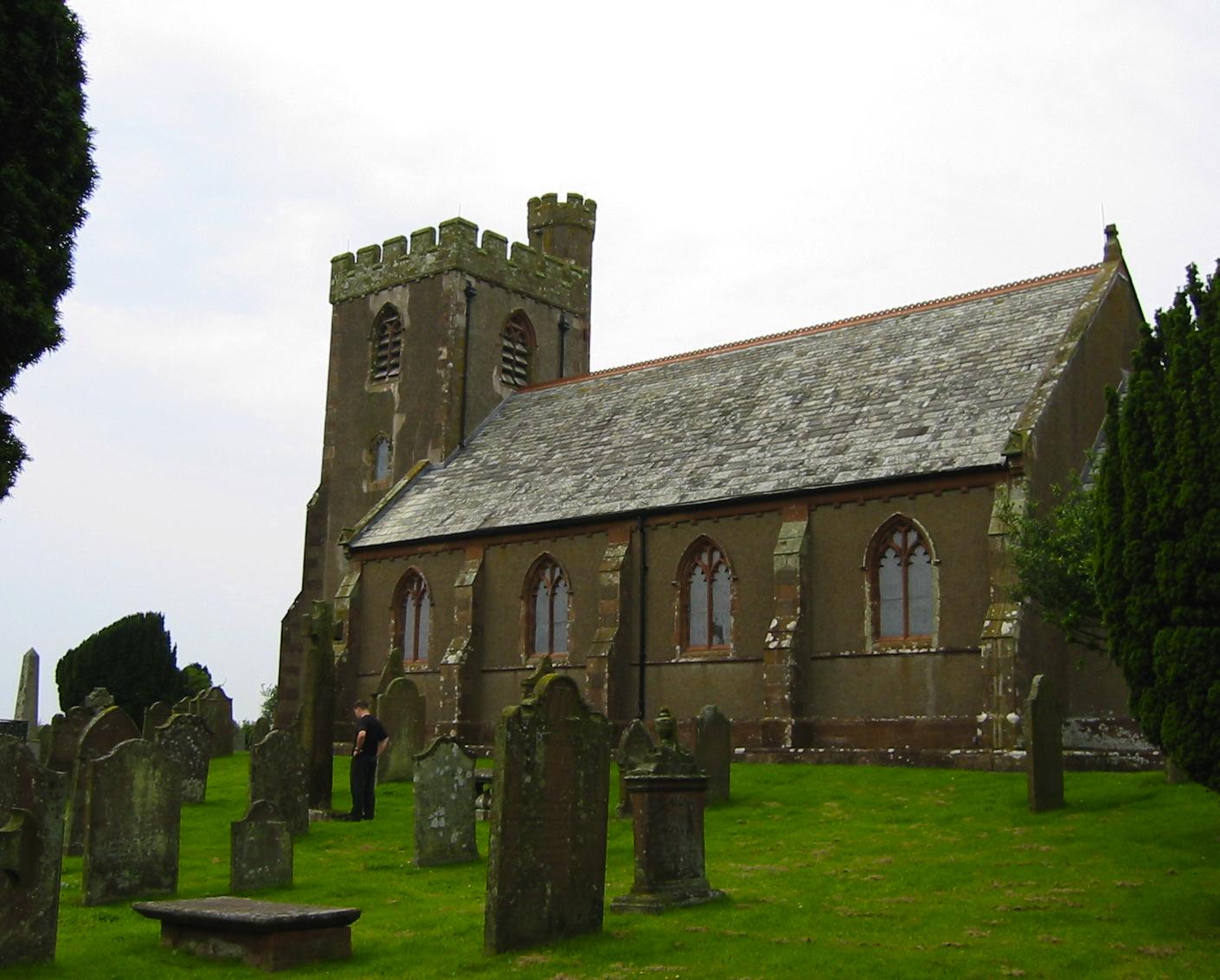 Then we walked out to the highway, crossed a river and a railway bridge and turned left with the A595. Just at this moment a train on the Eskdale miniature railway pulled in behind us and I took a picture of this too (I should have used the zoom). We then turned off on a hard and dry farm track and headed northeast for the Gasketh farm. This was relatively easy walking under humid, bright skies, with the sun overhead, and we made good progress up to the farm – where the track continued for another mile, in a more northwesterly direction, toward the distant tower of Irton church. Cars occasionally crawled down these hedgerow-encased lanes but there were no other walkers about and no one in the vicinity of the church – where we paused for our first rest.