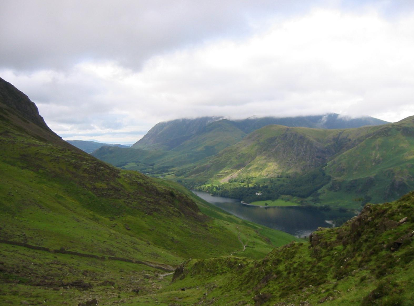 All this time the weather had been improving and at the pass we began to obtain wonderful views, even with a little sunlight thrown in on distant hillsides, of Buttermere itself. This was a familiar scene for me – since The Lees and the Linicks, after climbing Haystacks, had once made this same descent. In particular I got a real lump in my throat when I remembered the bravery and panache of our dog Toby, who flattened the miles on this route so many years ago.