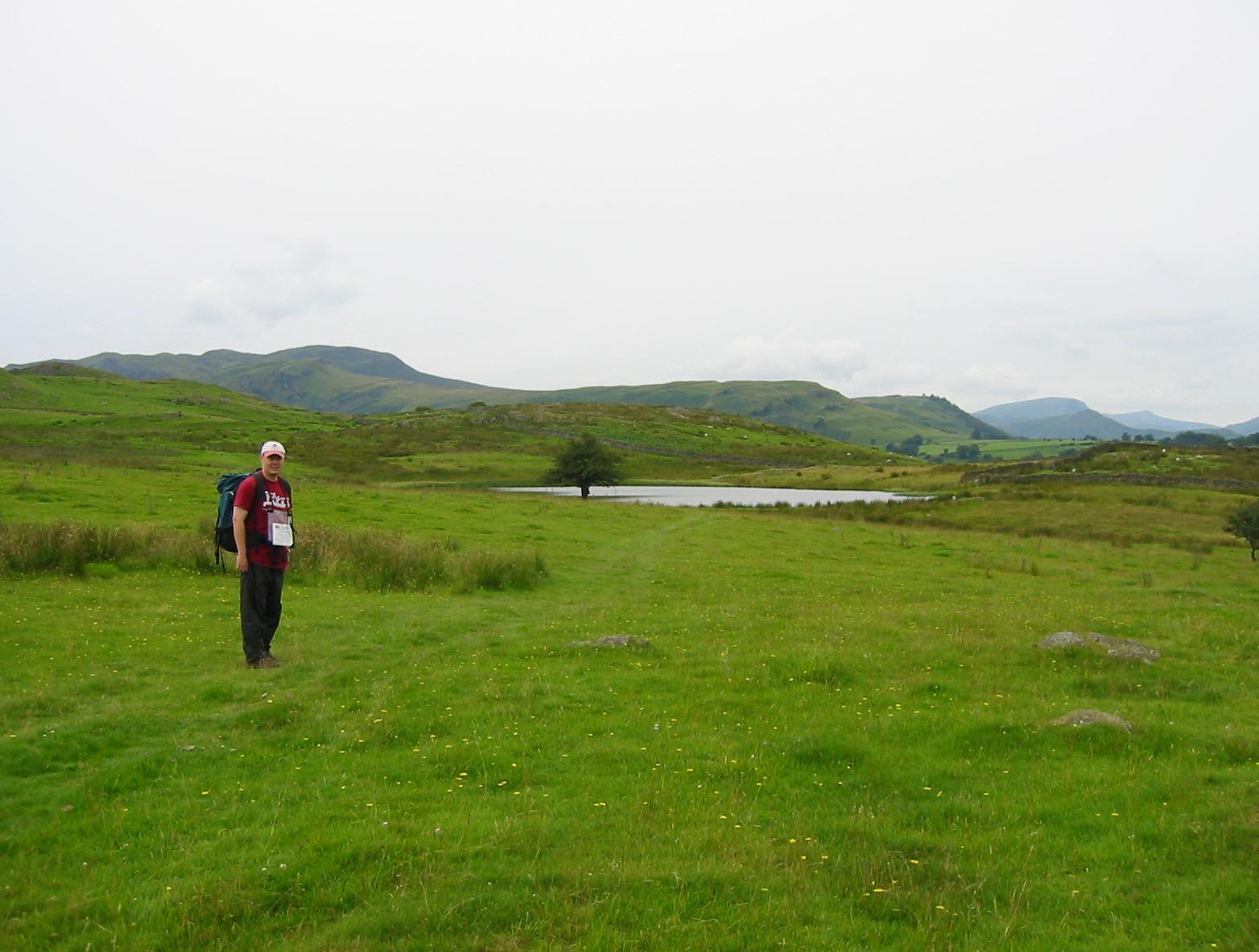A ribbon of tarmac lead downhill and around a corner past Goosewell Farm and then we climbed into a field for a further descent over rough ground to the Naddle Bridge. Then we used more roads to continue to the east, finally turning south on a zig-zag path that climbed a grassy field (well, I took the zig-zags; Gavan continued stolidly forward against a stone wall.) Over the crest we found Tewet Tarn and after passing this lonely body of water we continued climbing Low Rigg, passing quite a few trippers coming down from the little pass that now introduced us to the Vale, where we could already see the famous church of St. John’s.