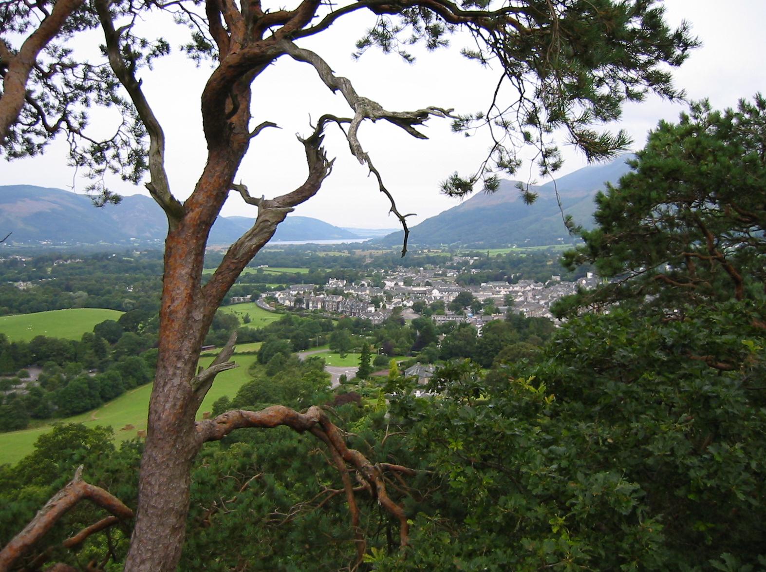 After a steep climb we reached a parting of the ways. Gavan wanted to continue forward but I wanted to follow Hannon’s suggestion – with a diversion up to the top of Castle Head on our right. So we did this, climbing steeply again, the last stages over the rocky top of this hill, and thus we obtained wide views of Derwentwater below. We took off our packs and I took two pictures, one of the lake to the left and one of Keswick to the right. It was cloudy bright this morning and the sun was always threatening to make a definitive breakthrough.