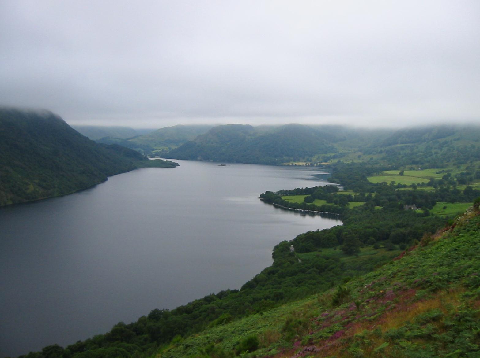 There followed a most desperate progress on greasy paths in bracken-covered slopes; it was with some irony that we noted that Hannon describes this section as a “happy journey,” though Gavan complained that our guidebook’s attention to surfaces wasn’t as thorough as he would have liked. We both fell several times as we squished over the slopes of Great and Little Meldrum – with more open spaces above Watermillock church at last providing some relief.