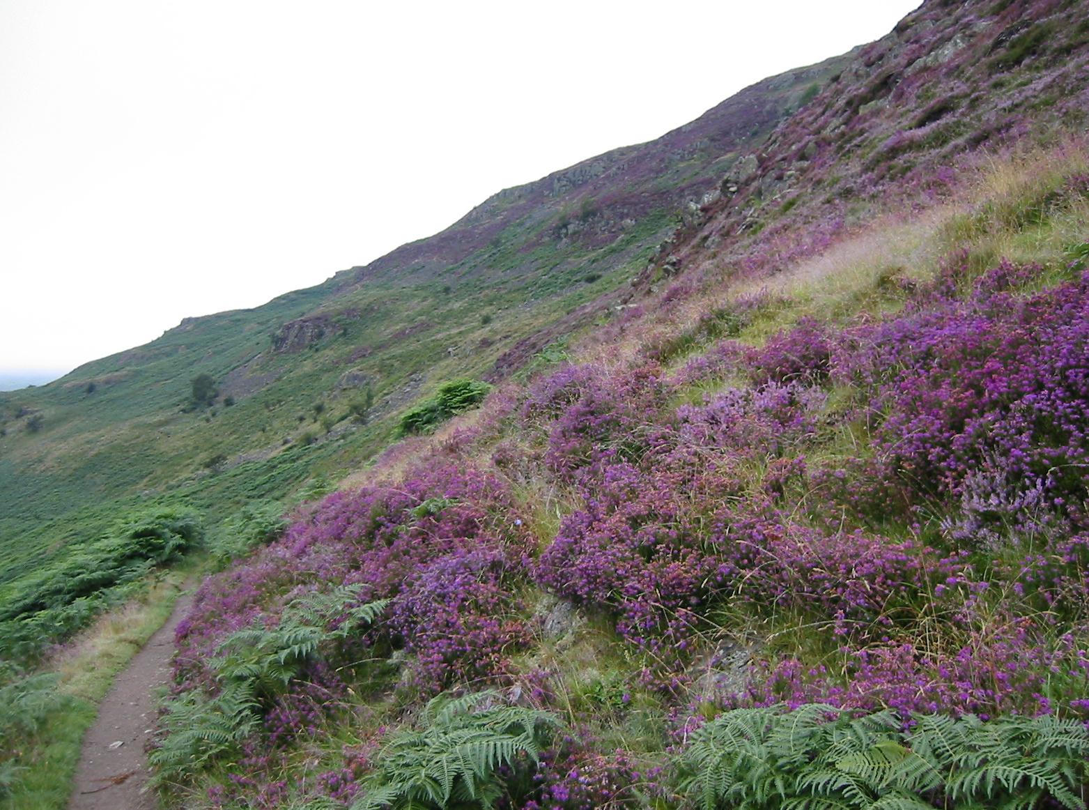 There were a few trippers about in the grey gloom of the beckside (which Dorothy and I had visited in 1967). So it was with some relief that we found an escape onto the flanks of Gowbarrow Fell, where a good path rose, not too steeply, above Lyulph’s Tower – as we headed east among our first outcrops of heather. Visibility, in fact, was rather good at the lower levels and we had a wonderful view down the lake, where I could pick out a ferry similar to the one that had transported our troupe (and Bertie) all the way from Glenridding to Pooley Bridge in 1985.