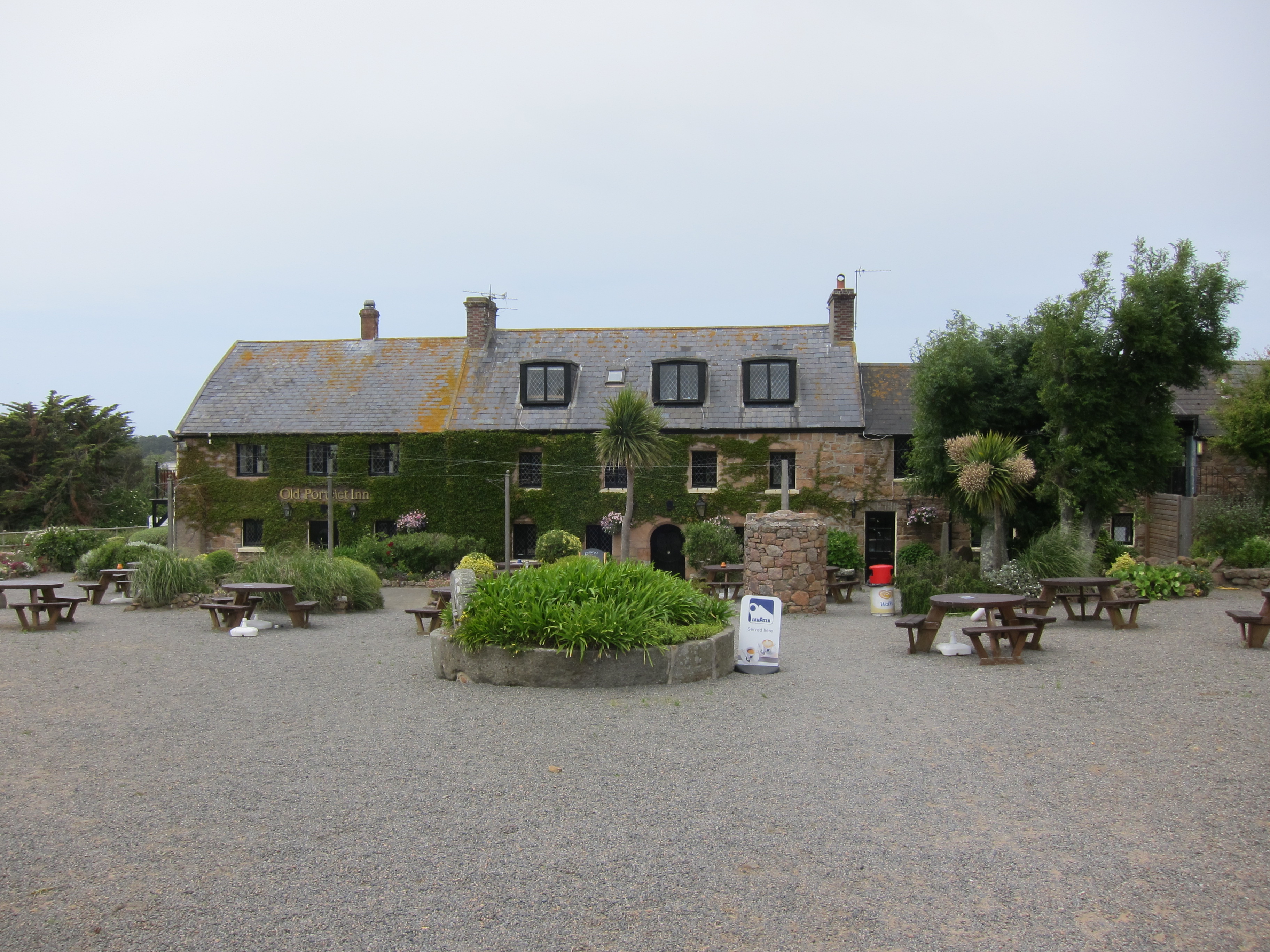 We took to a road inland and then veered off on another path, one which lead us through low vegetation (with views into Portelet Bay on our left) to Portelet itself and the spot I had chosen as our lunchtime refuge, the Old Portelet Inn. It was just going 1:00 and we had reached the halfway mark of the day’s walk. The place was crowded as well, but we found a table upstairs and I had a pint of lager and one of those hamburgers so huge that, even sliced in half, it seemed unlikely that it could be gripped by human hands. (Adrian always began each meal by trying to find some local product and I think he did consume a red cider-based drink here.) The old inn with its surrounding foliage was charming indeed and we enjoyed an hour’s break here – but at 2:00 or so it was time to move on.