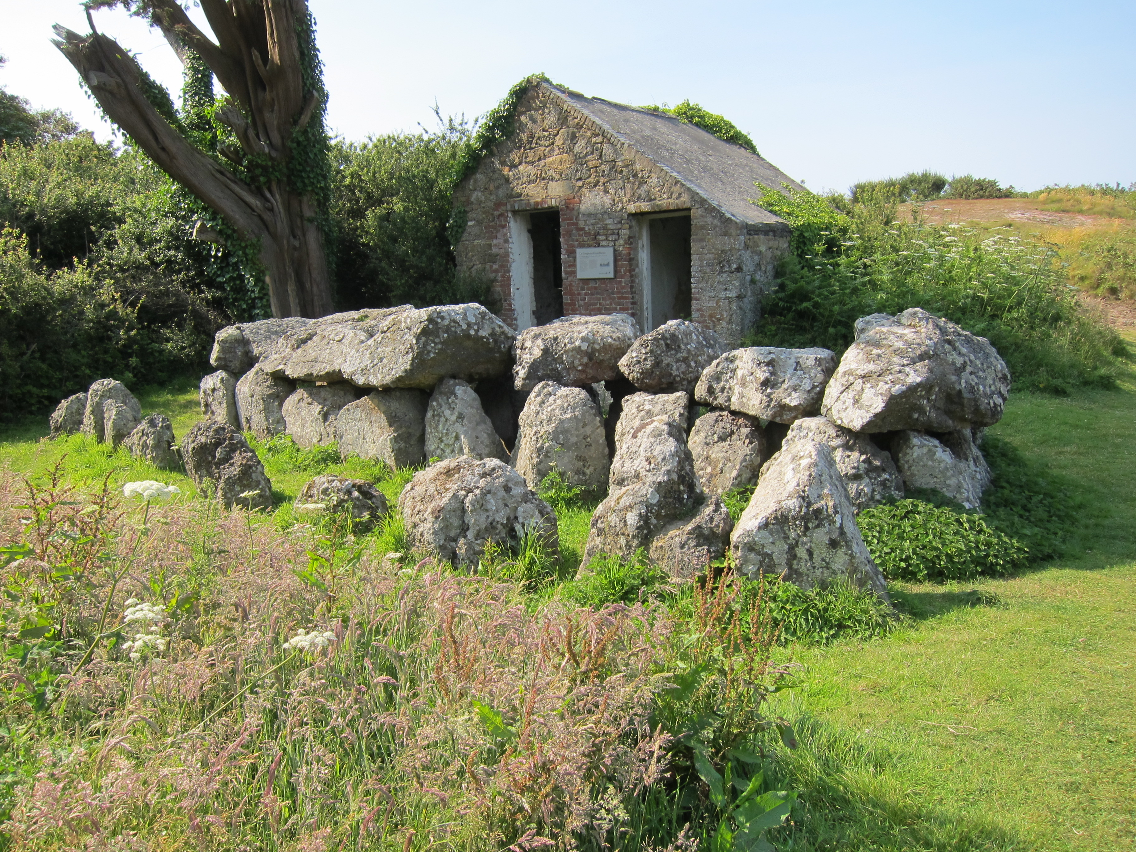 There was a good deal of late afternoon traffic on the road and so it was nice to escape this with a turnoff along a track signposted “Footpath to Le Scez.” A mallard pair floated serenely on a little pond at the bottom of a little valley and we circled around them to visit the old guardhouse that stood next to the Dolmen de Couperon. I sat down for a final rest while Adrian poked about a bit and then we climbed steeply uphill, reaching at last a series of rural roadways. Right, left, left – this brought us to a mile-long stretch of roadway that headed east and gradually turned a corner to drop down to the giant St. Catherine’s breakwater.