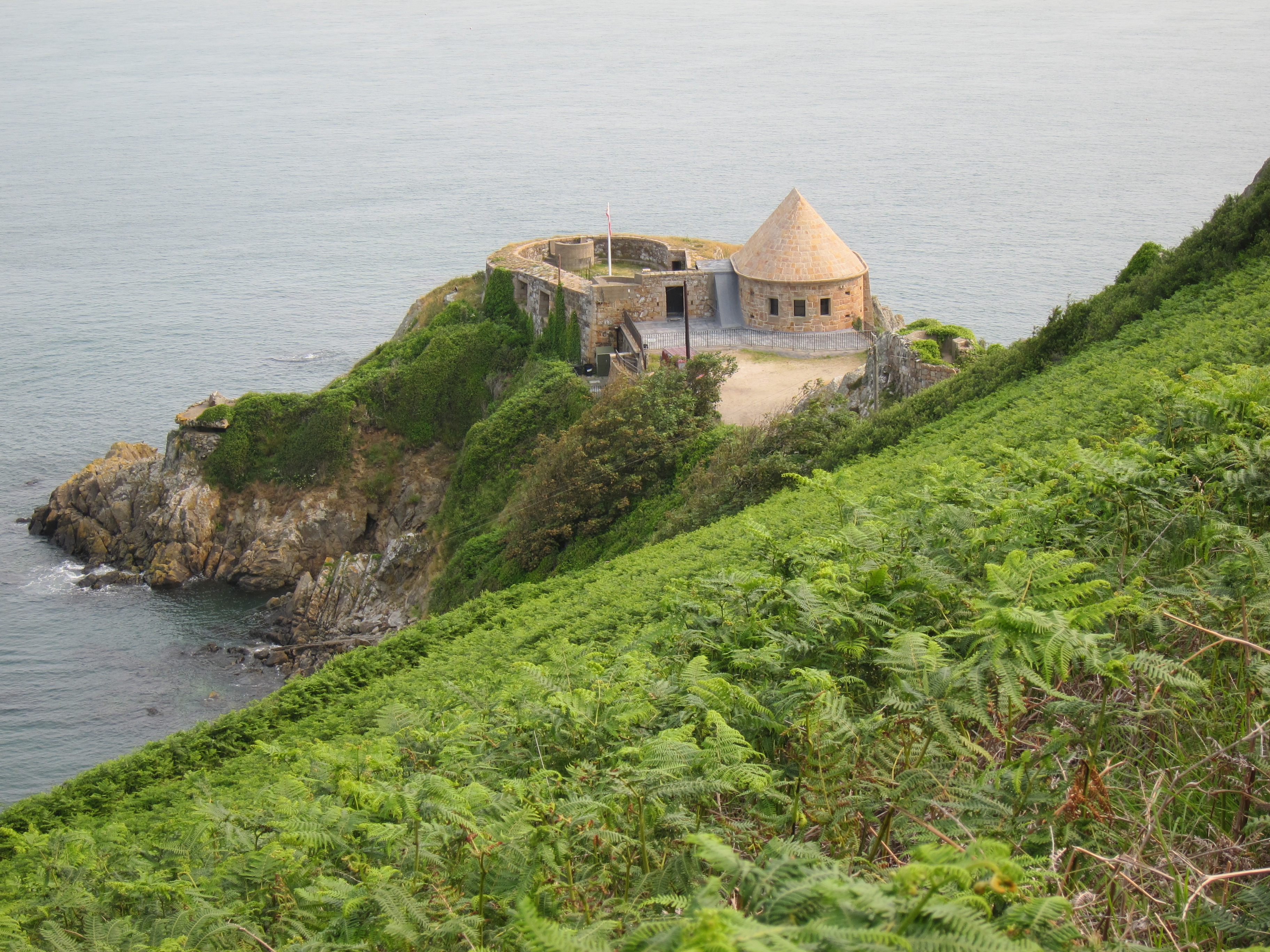 This was a nice rest for us (I had a blt and a pint of lager) and we were soon ready to resume our march. After climbing some steps we turned left and enjoyed a fairly level stretch. Of course this soon gave way to a pattern that Paddy Dillon refers to as “roller-coaster.” We reached a cottage called Son de la Mer – where almost fluorescent flowers climbed the wall above. More headlands followed, often with fortifications or navigational towers as we pressed forward in the afternoon sun. One of these massive projections, the Rozel headland, is the site of extensive quarrying and the cliff path had to head inland here. Off on our right was the road I would have used if we had visited the Jersey Zoo and at one point a sign indicated we were only a minute or so away from this road but Adrian wanted to press ahead and soon we were floundering around on alternate field paths. Two chaps with a Border Terrier suggested how we could reach the Rue du Câtel and soon we were moving downhill amid a number of interesting private dwellings into Rozel Bay.