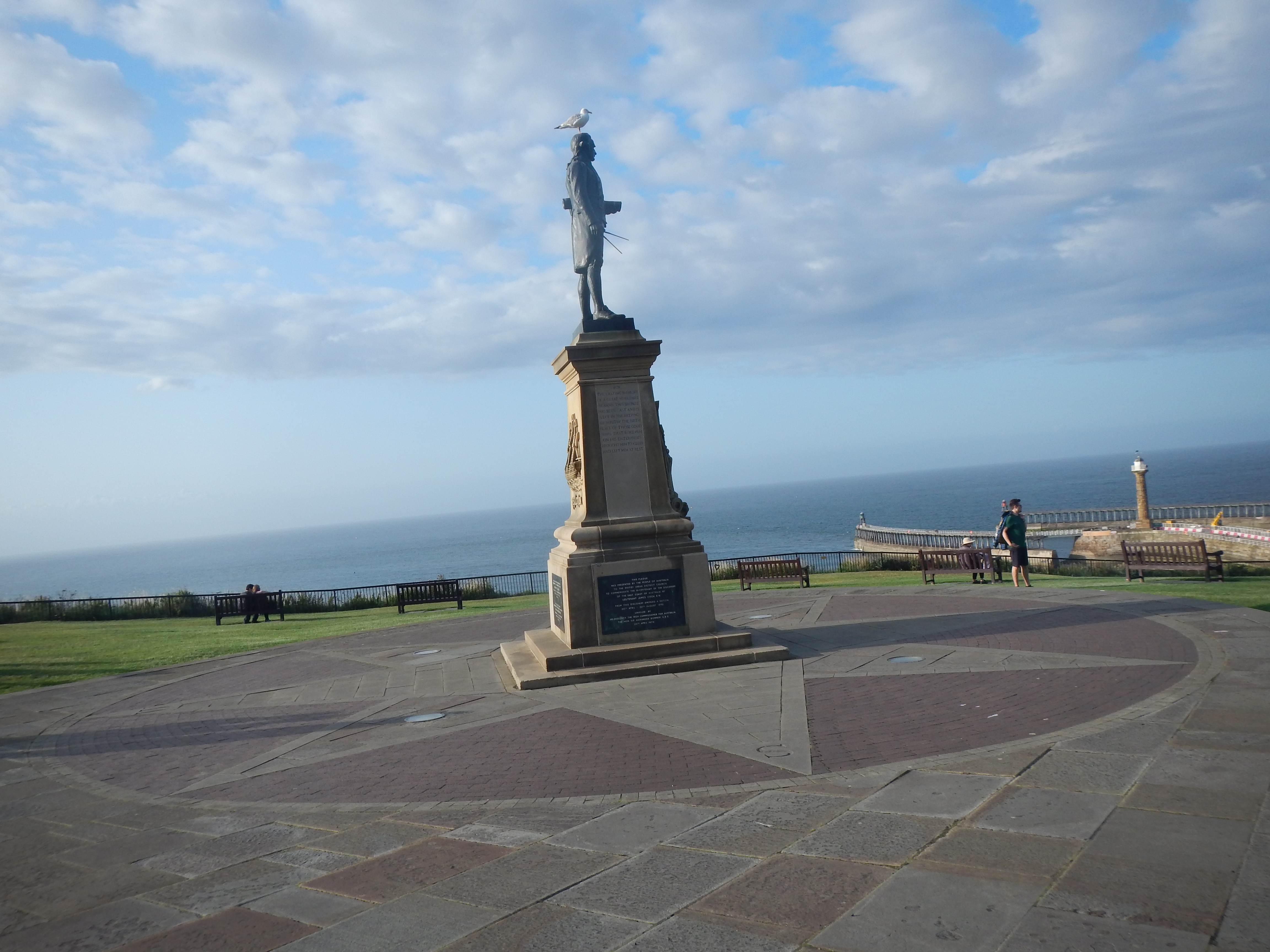 Our host David showed us to our room and, as I usually did, I threw off my clothes and collapsed onto my bed. I think I may even have dozed off while Gavan took his shower. I took mine as well and we set off in search of our evening meal. Whitby is a setting for Bram Stoker’s Dracula and the latter would certainly not have enjoyed the radiant late afternoon sunshine as we paused to take photos of the Captain Cook statue (with seagull on top) and the jawbones of a whale. Across the harbor there also stood the impressive ruins of Whitby Abbey.